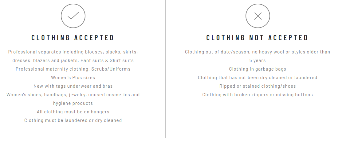 We will be accepting donations of gently loved professional attire to provide to disadvantaged women. Dress for Success provides professional clothing and counseling for each of their women. When a client secures a job interview, they provide her with one free business suit, as well as the appropriate accessories, footwear, and cosmetic/toiletry items. When she successfully lands the job, she returns to Dress for Success for up to one week’s worth of business attire.